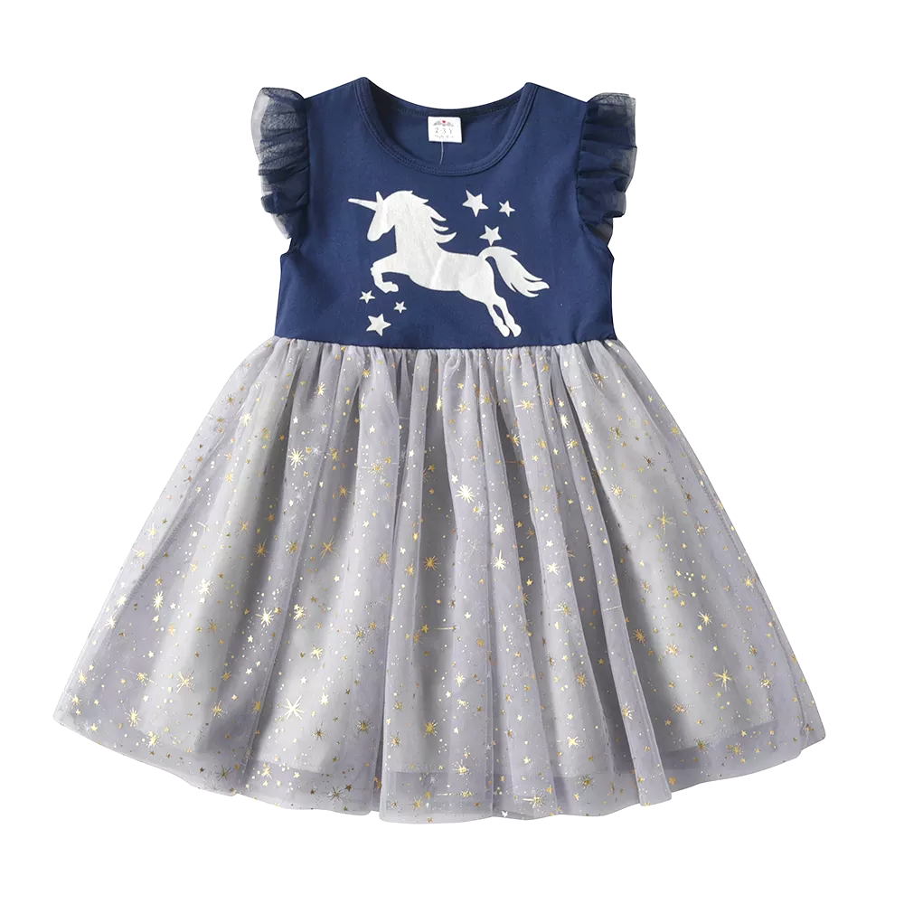 VKT Star Unicorn Print Grey Bottom Blue Frock 6046