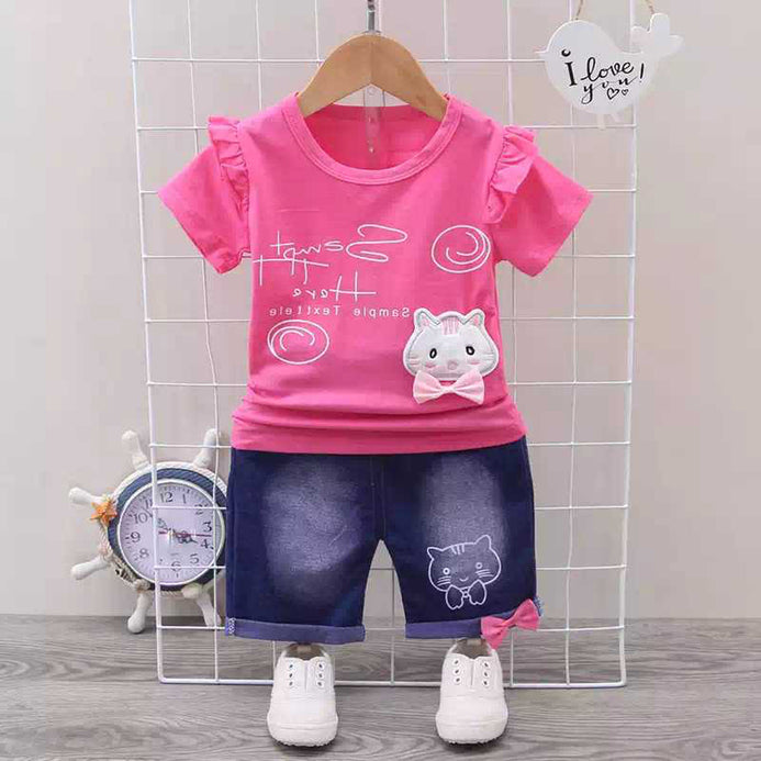 Yougi Shocking Pink Applique Cat Bow Face 2 Piece Set 2250