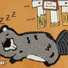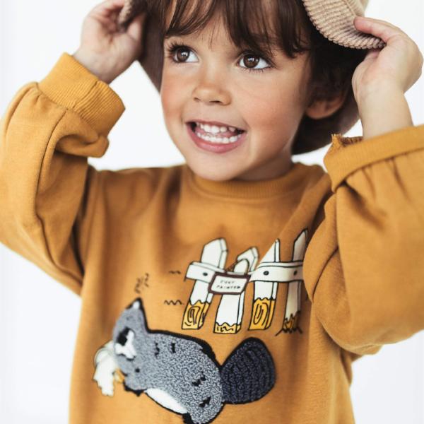 Featuring snap-button fastening along the shoulder and a front print with appliqués.