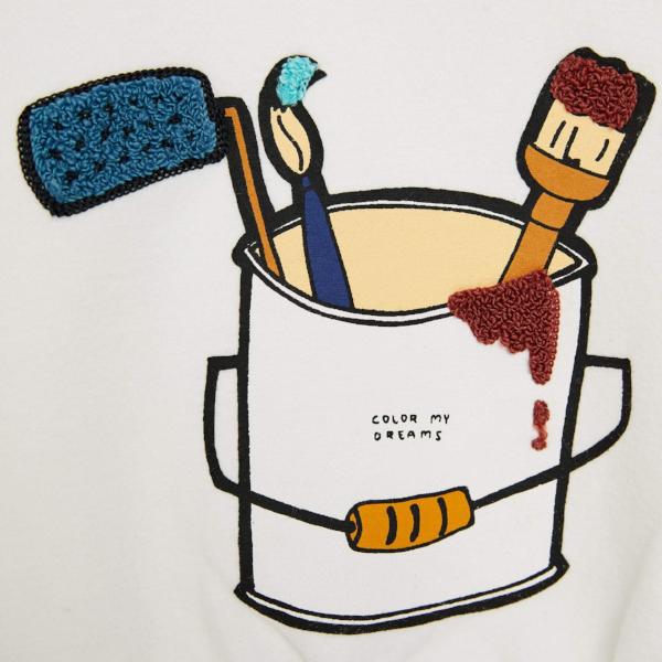 Featuring snap-button fastening along the shoulder and a front print with appliqués.