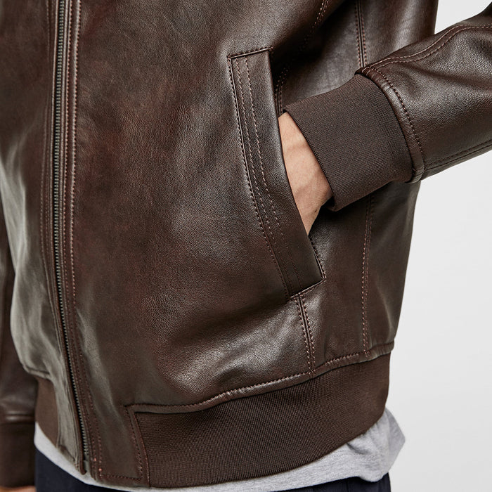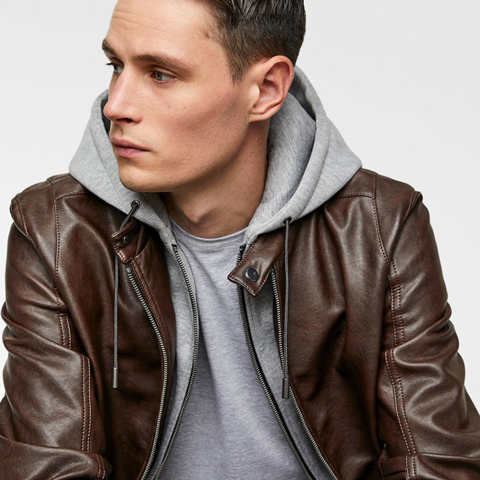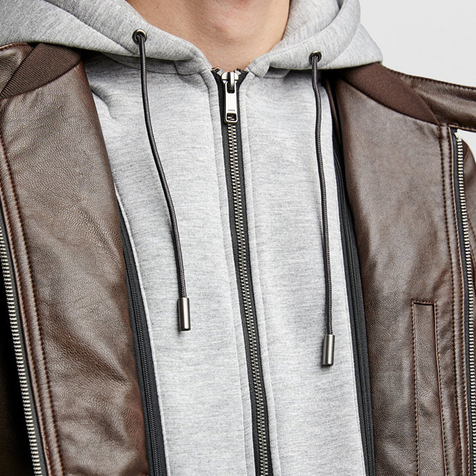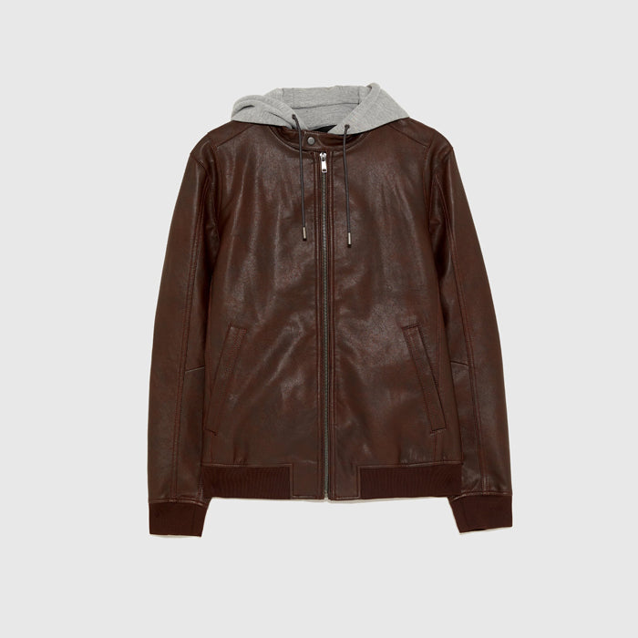 ZR Brown Contrasting Faux Leather Hoodie Jacket