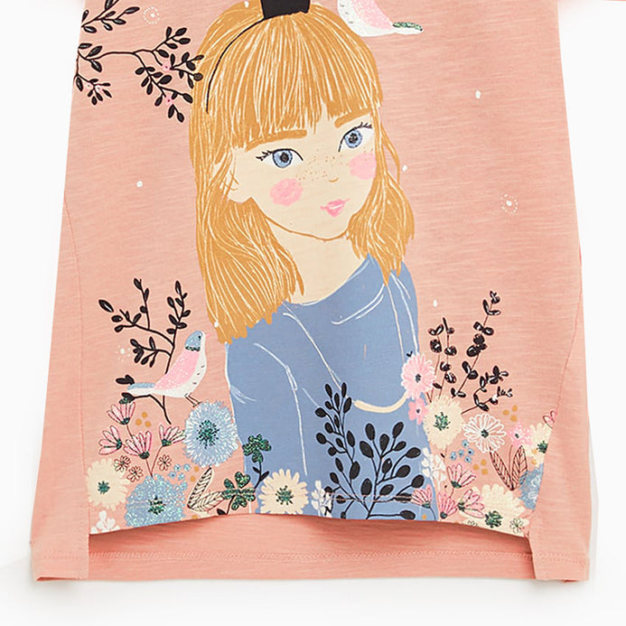 ZR Glitter Doll Printed Slub Tea-Pink Salmon Top