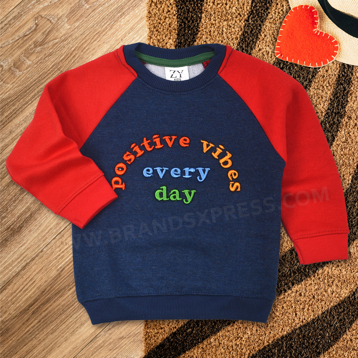 - ZY Kids Positive Vibes Every Day Embroided Blue & Red Contrast Fleece Sweatshirt 13606